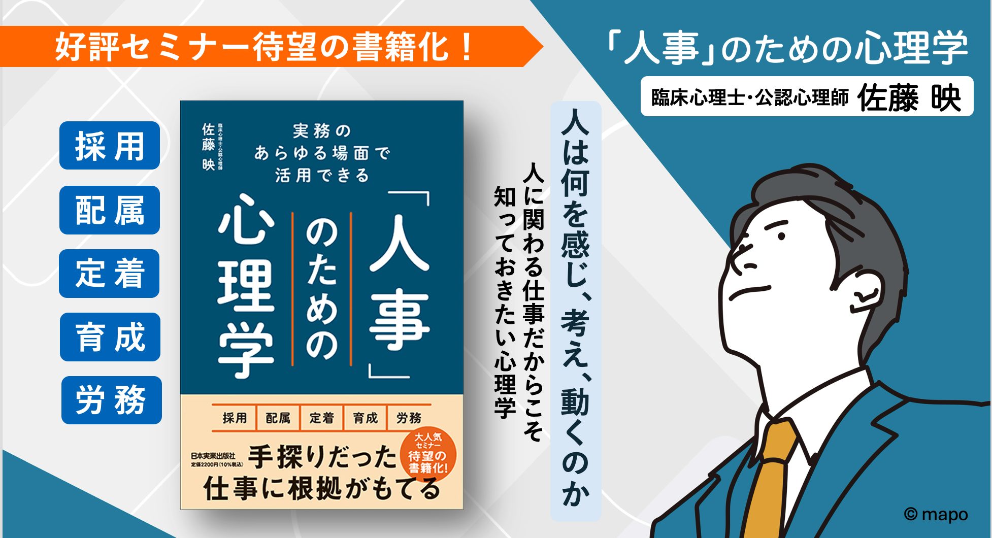本書の出版を記念し、著者である佐藤映による特別セミナーをオンラインにて開催いたします。書籍のエッセンスを凝縮し、心理学の基礎を1時間で学べるセミナーとなっております。また、当日は佐藤によるQ&Aコーナーの時間もあり、人事になりたての方でも深い理解を得ることが出来ます。